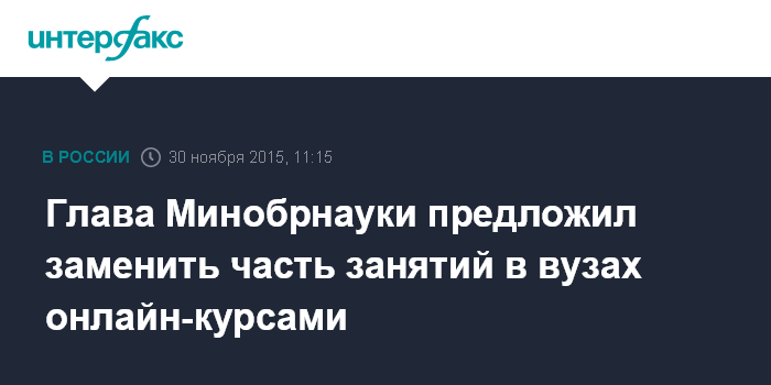 Москва. 30 ноября. INTERFAX.RU - Онлайн-курсы "Открытого образования" могут снизить нагрузку на преподавателей вузов и улучшить качество преподавания по отдельным предметам, считает глава Минобрнауки РФ Дмитрий Ливанов.