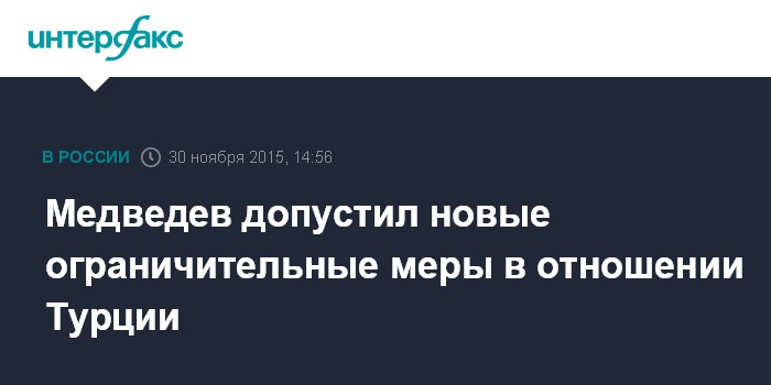 "Мы посмотрим, как будут развиваться события. У нас есть возможность в рамках полномочий, которые установлены указом, расширить перечень товаров, на которые будет распространяться соответствующий запрет на ввоз в Российскую Федерацию, расширить контингенты лиц, которые попадают под запрет для въезда в Российскую Федерацию, и применить другие меры, направленные на ограничение и сворачивание сотрудничества с Турецкой Республикой", - продолжил Медведев.