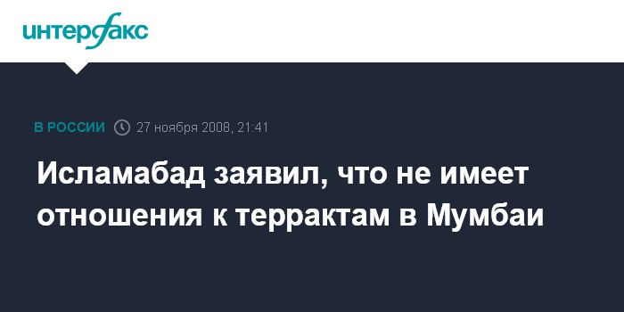Москва. 27 ноября. INTERFAX.RU - Представитель пакистанских спецслужб Зафар Икбал заверил в четверг, что его страна никак не связана с террористами, совершившими нападения в индийском городе Мумбаи.