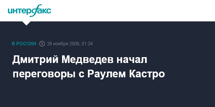 Гавана. 28 ноября. ИНТЕРФАКС - Президент России Дмитрий Медведев, прибывший с рабочим визитом на Кубу, начал переговоры с председателем Государственного Совета министров Кубы Раулем Кастро.