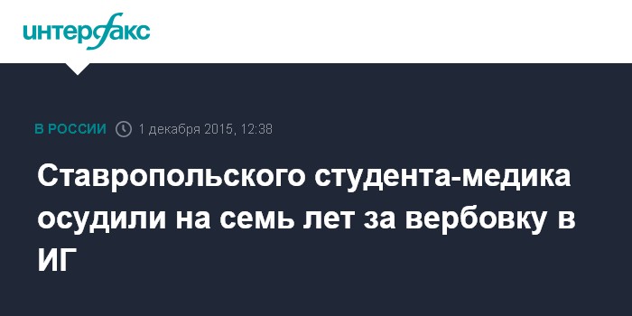 Москва. 1 декабря. INTERFAX.RU - Северо-Кавказский окружной военный суд во вторник приговорил к семи годам заключения в колонии общего режима студента Ставропольской медакадемии Султана Яхьяева, обвиняемого в участии в так называемом "джамаате" для пропаганды идей экстремизма, создания всемирного халифата ИГИЛ (запрещено в РФ), передал корреспондент "Интерфакса".