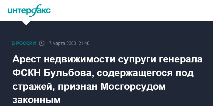 Москва. 17 марта. ИНТЕРФАКС - Мосгорсуд признал законным арест жилых и нежилых помещений, принадлежащих супруге генерал-лейтенанта ФСКН Александра Бульбова, который обвиняется в незаконном прослушивании телефонных переговоров.