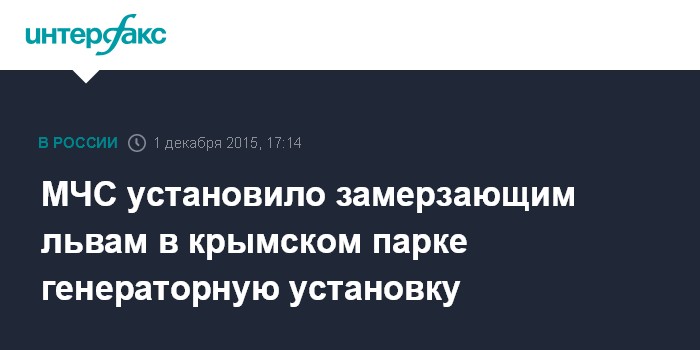 Москва. 1 декабря. INTERFAX.RU - Спасатели МЧС России установили дизельгенератор в белогороском парке львов "Тайган" в Крыму, без него жизнь зверей находилась под угрозой.