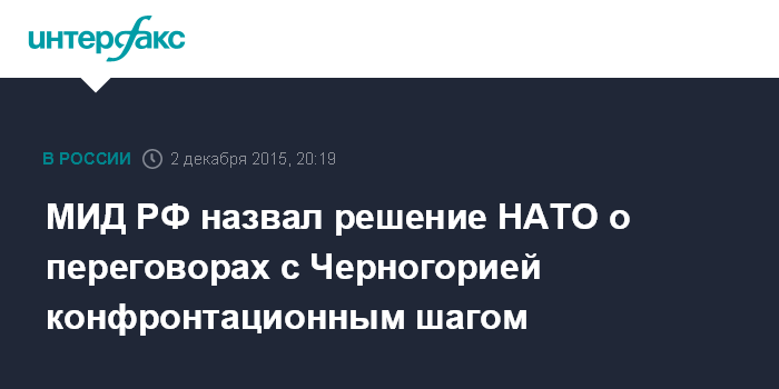 "Рассматриваем принятое в ходе заседания Совета НАТО на уровне министров иностранных дел 1-2 декабря в Брюсселе решение о начале переговоров с Черногорией о ее вступлении в Организацию Североатлантического договора как откровенно конфронтационный шаг, чреватый дополнительными дестабилизирующими последствиями для системы евроатлантической безопасности", - говорится в комментарии МИД РФ.
