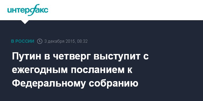 Москва. 3 декабря. INTERFAX.RU – Президент России Владимир Путин в четверг обратится с посланием к Федеральному cобранию.