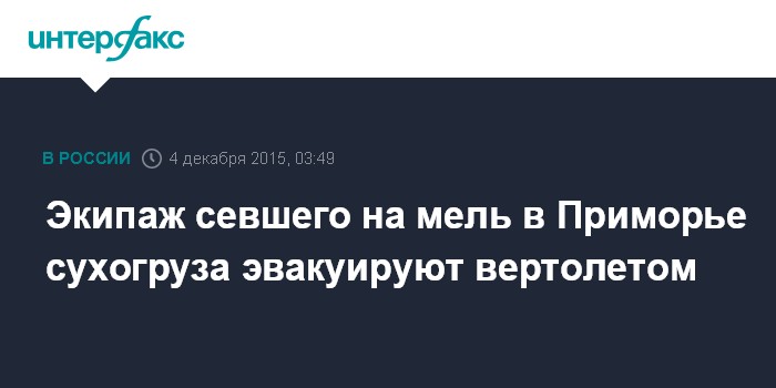 Москва. 4 декабря. INTERFAX.RU - Экипаж с сухогруза "Амур-36", выброшенного на мель во время шторма в бухте Золотая на севере Приморского края, собираются снимать с судна с помощью вертолета, сообщили "Интерфаксу" в морском спасательном подцентре (МСПЦ) "Южно-Сахалинск".
