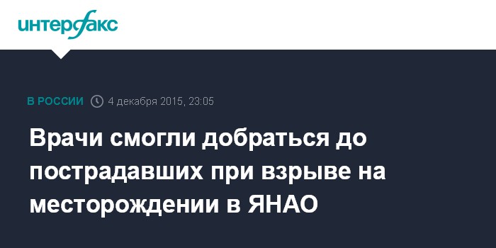 Москва. 4 декабря. INTERFAX.RU - Вертолет санавиации с врачами на борту прибыл на месторождение Малыгинское, где в пятницу вечером в результате взрыва погибли и пострадали люди, сообщается на сайте ГУ МЧС по Ямало-Ненецкому автономному округу.