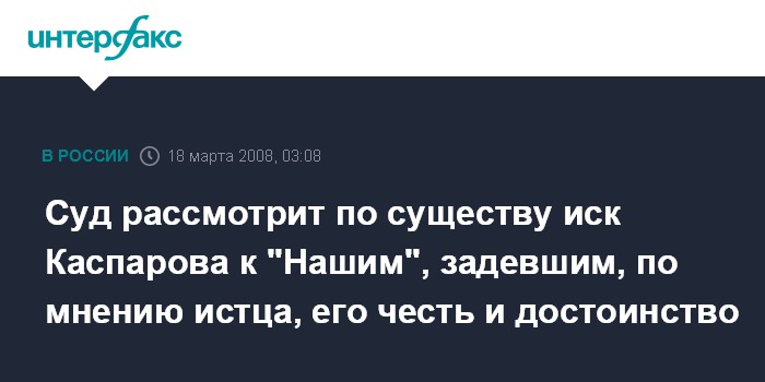 Москва. 18 марта ИНТЕРФАКС - Савеловский районный суд Москвы во вторник рассмотрит по существу иск лидера "Объединенного гражданского фронта" (ОГФ) Гарри Каспарова к движению "Наши" о защите чести, достоинства, деловой репутации и компенсации в размере 30 млн рублей.
