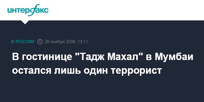 Москва. 28 ноября. INTERFAX.RU - Силы безопасности Индии возобновили бой с последним террористом, оставшимся в гостинице "Тадж Махал", сообщает сайт газеты Times of India.