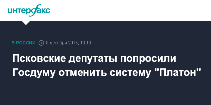 Москва. 8 декабря. INTERFAX.RU - Депутаты Псковского областного собрания обратились в Госдуму с просьбой отменить систему "Платон" для взимания сборов с водителей большегрузных автомобилей, сообщила во вторник пресс-служба регионального парламента.