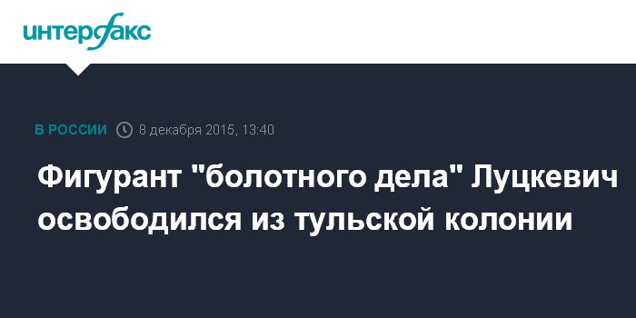 Москва. 8 декабря. INTERFAX.RU - Приговоренный к трем годам и шести месяцам колонии общего режима фигурант "болотного дела" Денис Луцкевич вышел на свободу из колонии в Туле после отбытия срока наказания, сообщил "Интерфаксу" во вторник источник в региональном УФСИН.