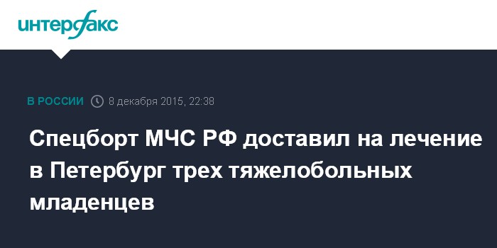 "Сегодня (08.12.2015) в 20:10 в Санкт-Петербург прибыл спецборт авиации МЧС России. В город на Неве из Симферополя и Москвы были доставлены три тяжелобольных ребенка 2015-го года рождения - две девочки и мальчик. Все дети нуждаются в срочной высококвалифицированной и высокотехнологичной медицинской помощи", - говорится в сообщении пресс-службы, поступившем в "Интерфакс" во вторник вечером.