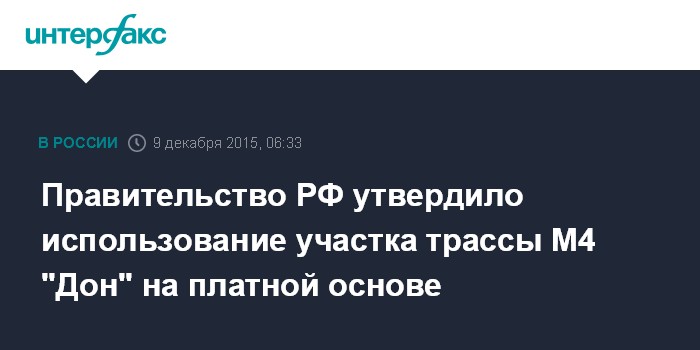 Москва. 9 декабря. INTERFAX.RU - Премьер-министр РФ Дмитрий Медведев подписал распоряжение, в соответствии с которым автомобильная дорога М4 "Дон" на участке 117 км - 225,6 км будет использоваться на платной основе, сообщается на официальном сайте правительства России.