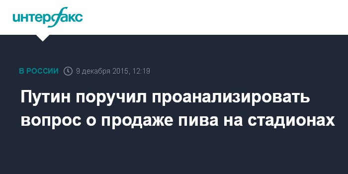Москва. 9 декабря. INTERFAX.RU - Президент РФ Владимир Путин не высказал свою точку зрения на предложение разрешить продажу пива на стадионах во время ЧМ-2018 по футболу и поручил заинтересованным ведомствам тщательно проанализировать этот вопрос.