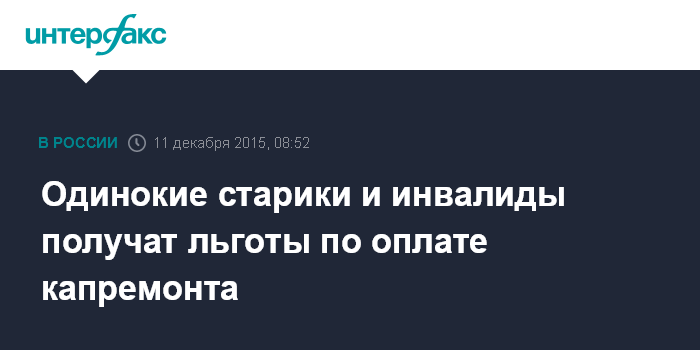 Москва. 11 декабря. INTERFAX.RU - Правительство РФ поручило региональным властям установить для одиноких пожилых граждан льготы при оплате взноса на капитальный ремонт многоквартирных домов, сообщает в пятницу сайт кабинета министров.