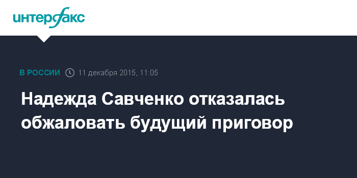 Москва. 11 декабря. INTERFAX.RU - Украинская летчица Надежда Савченко, обвиняемая в причастности к гибели российских журналистов, не намерена обжаловать приговор, который ей вынесет Донецкий городской суд в Ростовской области, сообщил "Интерфаксу" ее адвокат Илья Новиков.