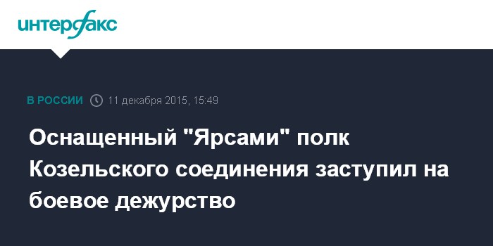 Москва. 11 декабря. INTERFAX.RU - Ракетный полк Козельского соединения, оснащенный ракетным комплексом стратегического назначения "Ярс", приступил к боевому дежурству, сообщил в пятницу командующий Владимирским ракетным объединением генерал-лейтенант Сергей Сивер.