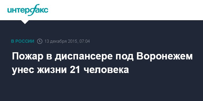 Москва. 13 декабря. INTERFAX.RU - В пожаре в психоневрологическом диспансере под Воронежем в общей сложности погиб 21 человек, сообщили "Интерфаксу" в центральном региональном центре МЧС РФ.