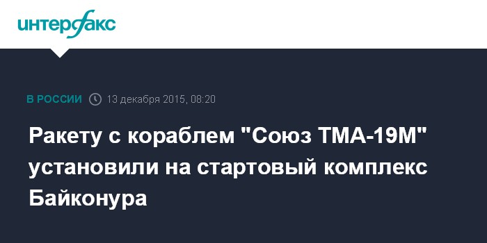 Москва. 13 декабря. INTERFAX.RU - Ракета-носитель "Союз-ФГ" с пилотируемым кораблем "Союз ТМА-19М" установлена на первой стартовой площадке космодрома Байконур, передает корреспондент "Интерфакса".