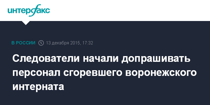 Москва. 13 декабря. INTERFAX.RU - Сотрудники СУ СКР по Воронежской области начали допрос медицинского персонала Новохоперского психоневрологического диспансера, где на пожаре погибли 23 человека.