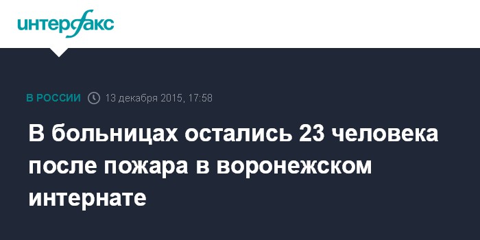 Москва. 13 декабря. INTERFAX.RU - Медики оценивают как стабильное состояние более 20 пострадавших в пожаре в психоневрологическом интернате в Воронежской области, сообщил "Интерфаксу" в воскресенье официальный представитель Минздрава России Олег Салагай.
