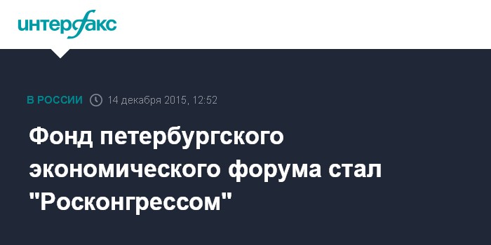 Москва. 14 декабря. INTERFAX.RU - Фонд "Петербургский международный экономический форум" переименован в фонд "Росконгресс". Соответствующие изменения внесены в ЕГРЮЛ 2 декабря, следует из базы данных "СПАРК-Интерфакс".