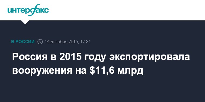 Москва. 14 декабря. INTERFAX.RU - Россия в 2015 году поставила за рубеж продукции военного назначения на $11,6 млрд, портфель заказов - более $57 млрд, сообщил в понедельник помощник президента РФ по вопросам военно-технического сотрудничества Владимир Кожин.