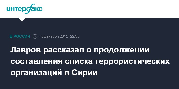 "Эта работа (по составлению списка террористических организаций - ИФ), которая продолжается. Уже ясно, что ИГИЛ и Джабхат-ан-нусра (запрещенные в РФ - ИФ) всеми признаются террористическим организациями, с которыми не может быть никаких переговоров, которые не будут частью прекращения огня, когда начнется политический процесс, когда условия для этого созреют",- сказал глава МИД РФ.