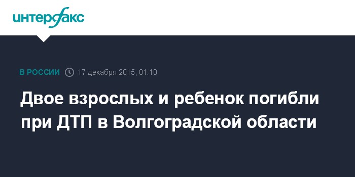 Москва. 17 декабря. INTERFAX.RU - Двое взрослых и десятилетняя девочка погибли в дорожно-транспортном происшествии в Волгоградской области, сообщил в четверг "Интерфаксу" заместитель руководителя пресс-службы регионального управления МВД России Антон Корнаухов.