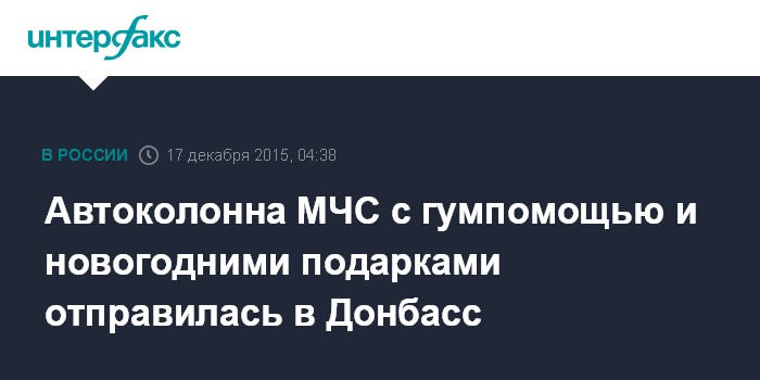 Москва. 17 декабря. INTERFAX.RU - Автомобили МЧС РФ с гуманитарной помощью и новогодними подарками отправилась в Донбасс, сообщили "Интерфаксу" пресс-службе МЧС России.