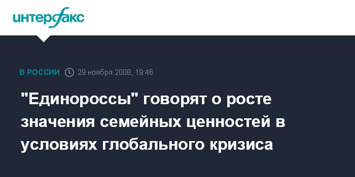 Москва. 29 ноября. ИНТЕРФАКС - Представители "Единой России" считают, что в условиях финансового кризиса и локальных конфликтов возрастают роль и значение семьи, материнства и детства.