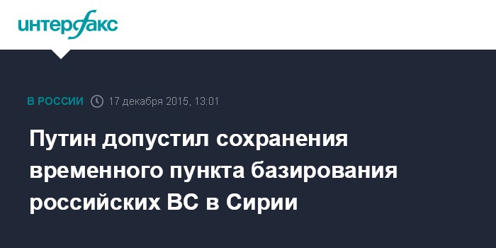 Москва. 17 декабря. INTERFAX.RU - Президент Владимир Путин считает, что Москва могла бы сохранить в Сирии пункт временного базирования для Вооруженных сил РФ.
