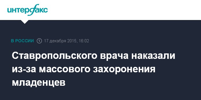 Москва. 17 декабря. INTERFAX.RU - Министерство здравоохранения Ставрополья наказало главного врача краевого перинатального центра по результатам проверки о массовом захоронении мертворожденных младенцев, сообщает пресс-служба краевой прокуратуры.