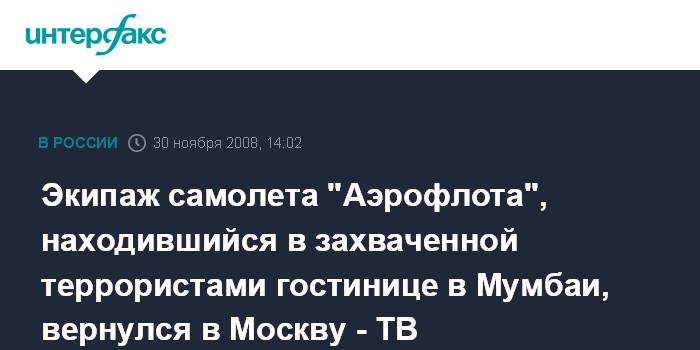 Экипаж самолета "Аэрофлота", находившийся в захваченной террористами гостинице в Мумбаи, вернулся в Москву - ТВ