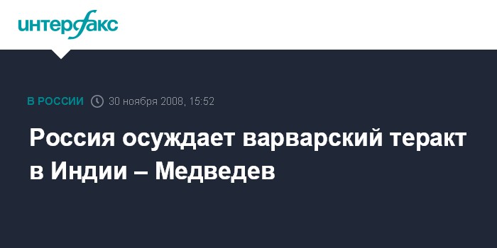 "Несколько дней назад произошёл ужасный, варварский теракт в Индии. Российская Федерация, как и другие государства, осуждает то, что произошло. Мы выражаем соболезнования нашим индийским коллегам, всем, кто пострадал в этом ужасном теракте", - заявил Д.Медведев.