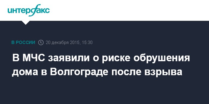 Москва. 20 декабря. INTERFAX.RU - Риск обрушения конструкций остается в жилом доме в Волгограде, где в воскресенье произошел взрыв бытового газа. Об этом заявил глава МЧС России Владимир Пучков в ходе селекторного совещания в воскресенье.
