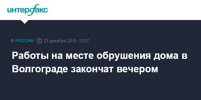Москва. 21 декабря. INTERFAX.RU - Аварийно-спасательные работы на месте частичного обрушения жилого дома в Волгограде планируется завершить в понедельник к 18 часам по московскому времени, сообщили "Интерфаксу" в пресс-службе губернатора Волгоградской области.