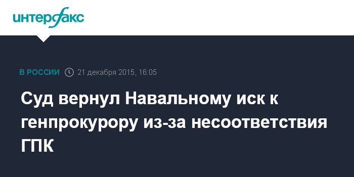 "Определением судьи от 17 декабря 2015 года исковое заявление было возвращено в связи с тем, что не соответствует п.2. ч.1 ст.135 ГПК РФ, а именно, как следует из представленных материалов дела, исковое заявление подано от имени некоммерческой организации "Фонд борьбы с коррупцией" Навального, Георгия Албурова, Любови Соболь представителем Фонда Иваном Ждановым. Между тем, из представленных материалов не следует, что истцы уполномочили Жданова правом на подачу искового заявления от их имени в суд", - сообщили "Интерфаксу" в Тверском суде.