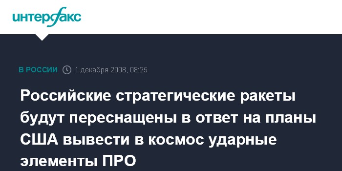Российские стратегические ракеты будут переснащены в ответ на планы США вывести в космос ударные элементы ПРО