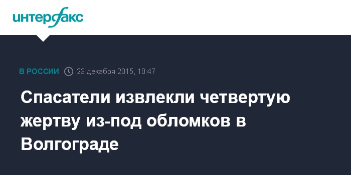 Москва. 23 декабря. INTERFAX.RU - Спасатели только что извлекли из-под завалов частично обрушенного в результате взрыва газа жилого дома по улице Космонавтов в Волгограде четвертого погибшего, сообщила "Интерфаксу" пресс-секретарь следственного управления СКР по Волгоградской области Наталья Куницкая.