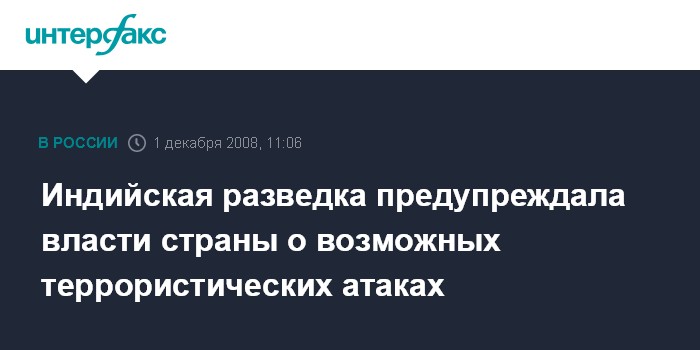 Москва. 1 декабря. INTERFAX.RU - Власти Индии несколько месяцев назад получили предупреждение от служб разведки о возможных террористических атаках, похожих на те, что произошли в Мумбаи на минувшей неделе, утверждает в понедельник межарабская телекомпания "Аль-Джазира".