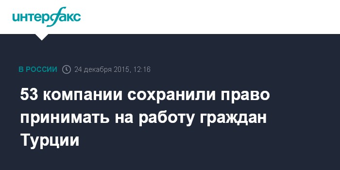 Москва. 24 декабря. INTERFAX.RU - Правительство РФ включило 53 компании и организации в перечень работодателей и заказчиков работ, на которых не распространяется запрет на привлечение с 1 января 2016 года граждан Турции для трудовой деятельности.