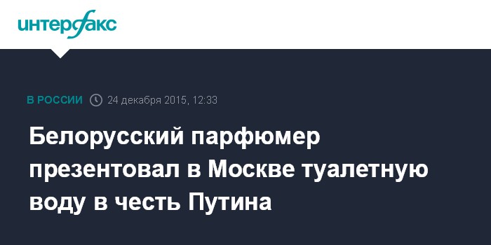 Москва. 24 декабря. INTERFAX.RU - Белорусский парфюмер Владислав Рикунов создал туалетную воду в честь президента России Владимира Путина, сообщение об этом размещено на странице журнала Leaders в фейсбуке.