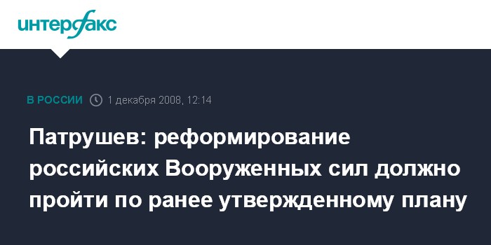 Патрушев также отметил, что реформирование затронет не только Минобороны. "Если пройдет реализация так, как она должна происходить, то есть коснется не только министерства обороны, но и сопутствующих ведомств, которые должны оказать содействие - то это будет реализация намеченных планов", - заявил секретарь СБ РФ.