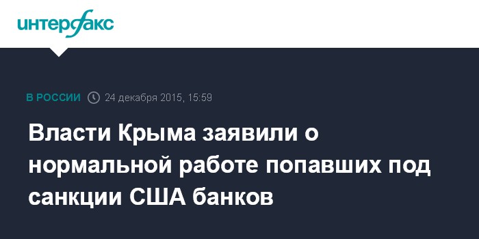 Москва. 24 декабря. INTERFAX.RU - Отделения попавших под санкции Запада банков в Крыму работают на полуострове в обычном режиме, заявил губернатор Севастополя Сергей Меняйло.