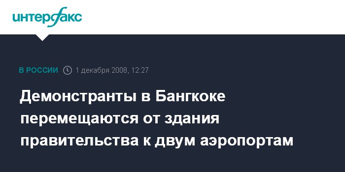 Москва. 1 декабря. INTERFAX.RU - Один из руководителей демонстрантов в Бангкоке поручил в понедельник своим сторонникам направиться от занимаемого ими здания правительства к двум столичным аэропортам, сообщает агентство ЭФЭ.