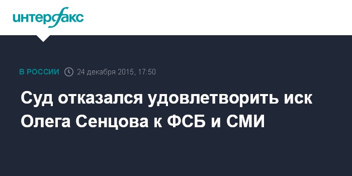 Москва. 24 декабря. INTERFAX.RU - Мещанский суд Москвы в четверг отклонил иск о защите чести и достоинства украинского режиссера Олега Сенцова, приговоренного к 20 годам колонии в России, к ФСБ и некоторым российских СМИ.