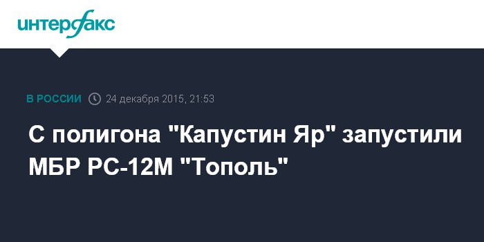 Москва. 24 декабря. INTERFAX.RU - Боевой расчет Ракетных войск стратегического назначения провел в четверг испытательный пуск межконтинентальной баллистической ракеты (МБР) РС-12М "Тополь", сообщил "Интерфаксу" представитель управления пресс-службы и информации Минобороны РФ по РВСН полковник Игорь Егоров.