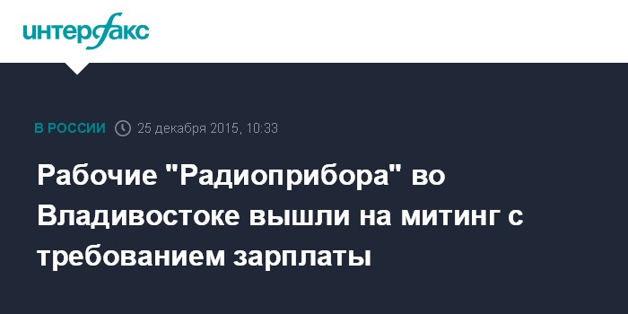 Москва. 25 декабря. INTERFAX.RU - Около 300 работников оборонного завода "Радиоприбор" в пятницу провели митинг во Владивостоке с требованием погасить задолженность по зарплате, которую они не получали уже несколько месяцев.