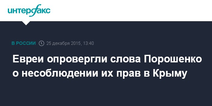 Москва. 25 декабря. INTERFAX.RU - Еврейские организации Крыма категорически опровергли заявления президента Украины Петра Порошенко о несоблюдении прав евреев на полуострове, сделанные им на днях в парламенте Израиля.